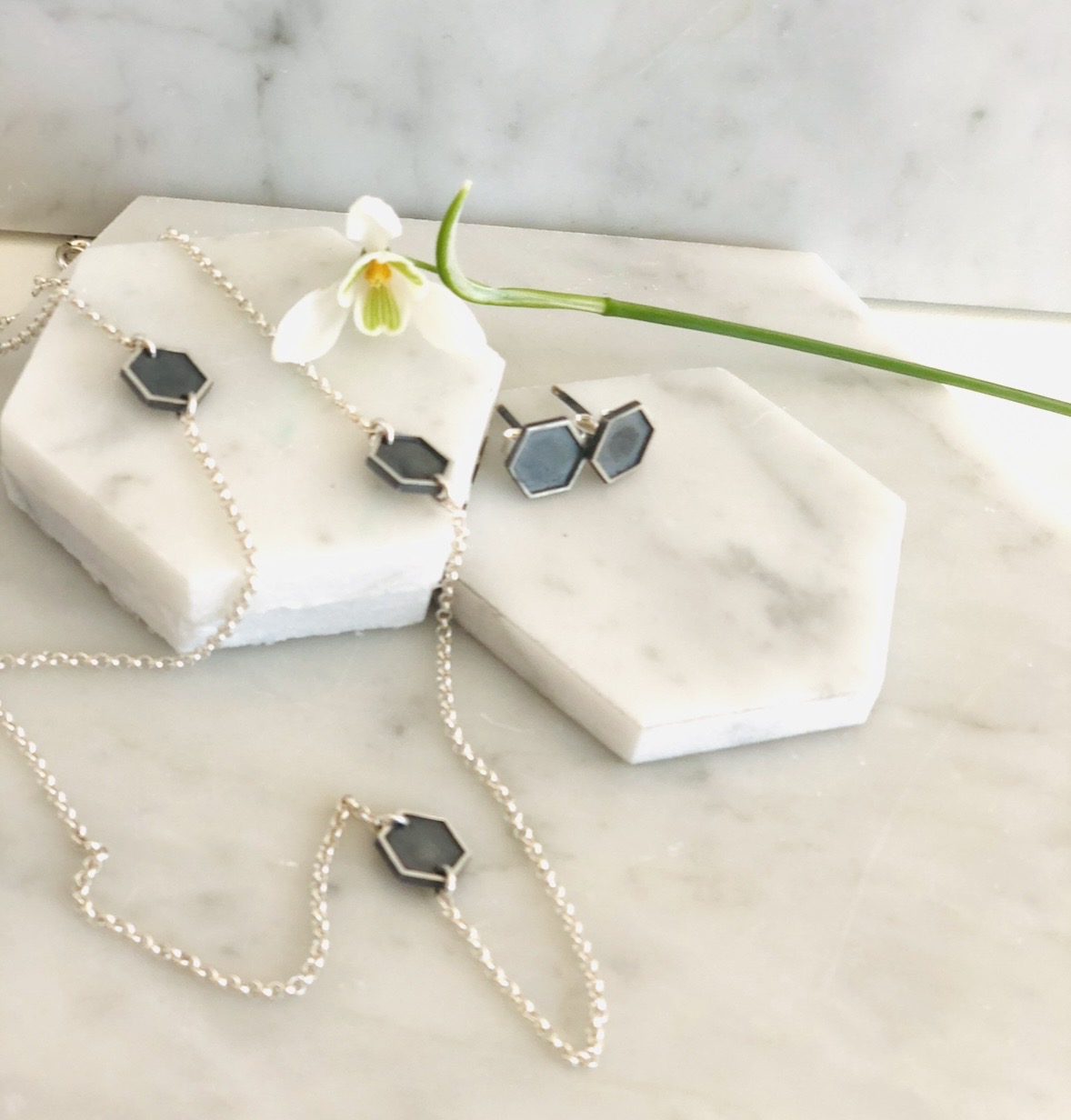 Heksagon-Mini armbånd i oksidert sølv, 1.5mm ertelenke. I serien fås også øredobb og anheng.