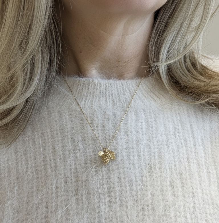 Anheng i forgylt 925 sølv med tre ulike heng, kongle (10mm), blad og et cubic sirconia sten. Kjedet er justerbart 45-50cm. I serien finnes også ørepynt.