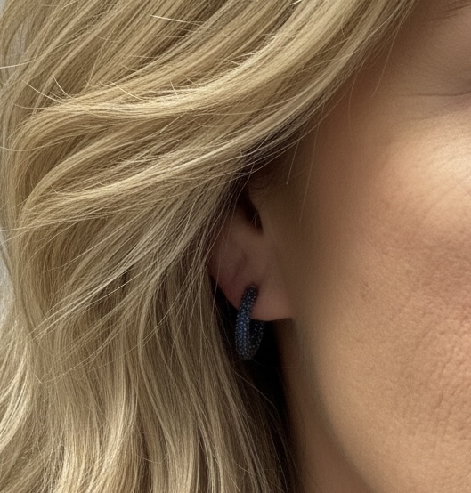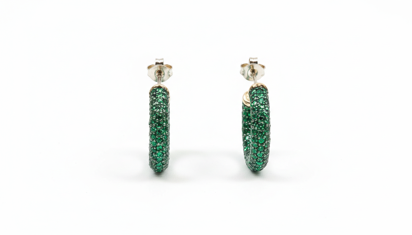 Kraftige runde Loops stehsatt rundt hele med blå Cubik sirkonia, håndfattet. Ytre diameter 12mm. Fåes i blå eller grønne stener.