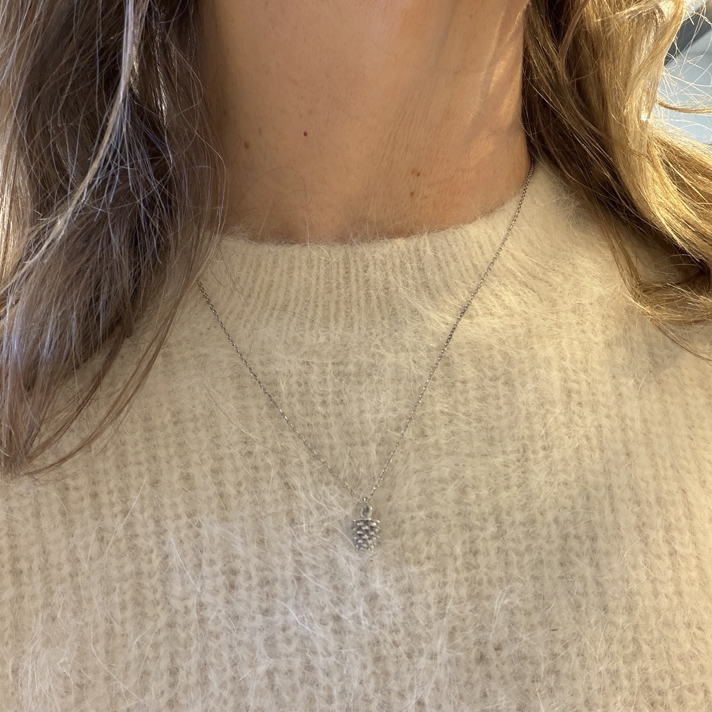 Liten kongle i forgylt 925 sølv, med kjede som kan justeres 45-50cm. Konglen er totalt 10mm høy. Finnes også i rhodinert sølv og øreheng.