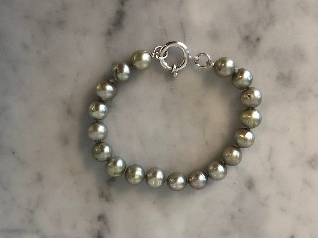 Armbånd av ujevne mintgrønne perler fra Susanne Friis Bjørner. Lengde 19.5mm, gjærlås av sølv 13mm i diam.