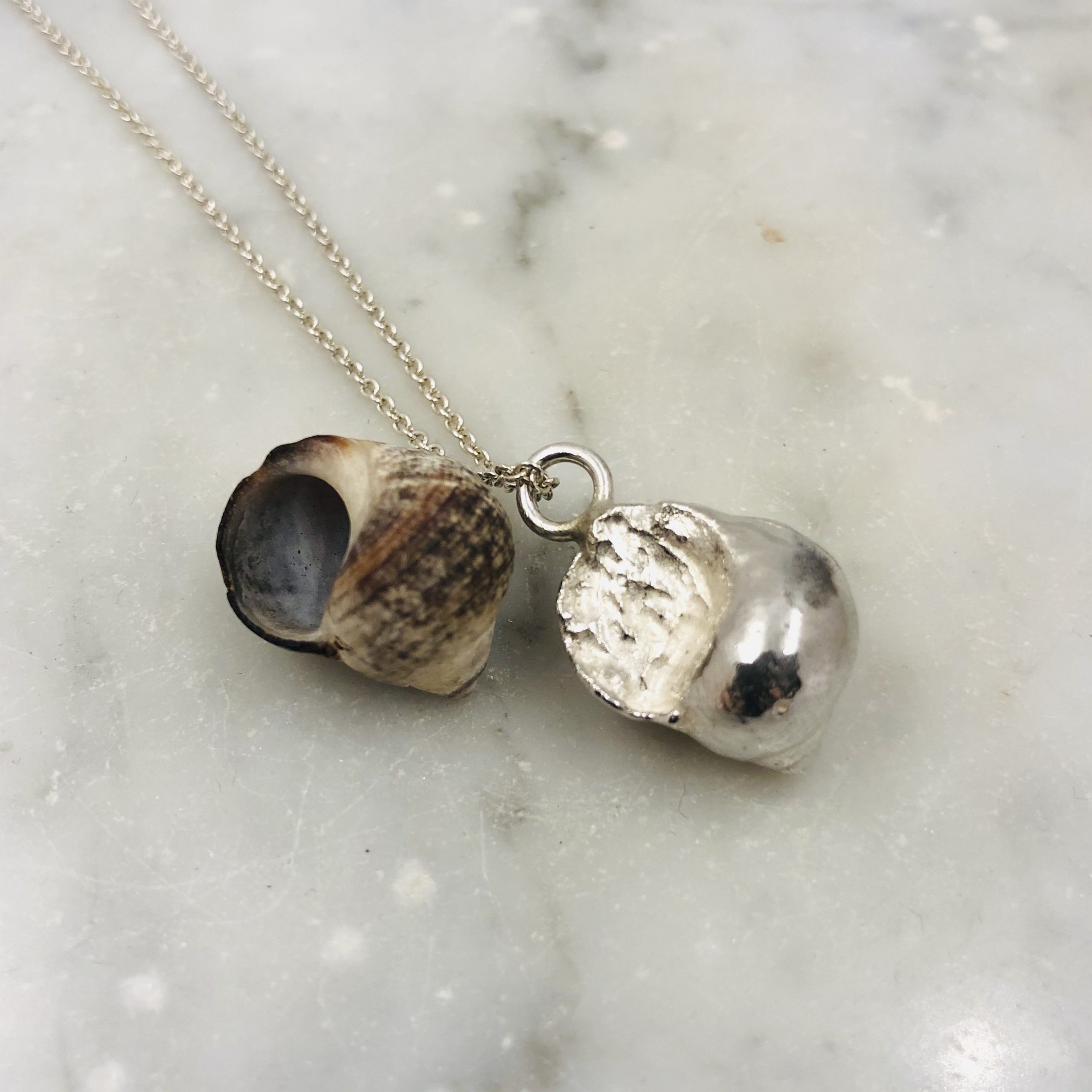 Anheng av sandstøpt strandsnegle, massivt sølv. 45 cm sølvkjede følger med. Høyde anheng ca. 20mm. Da hvert anheng støpes individuelt, kan små variasjoner forekomme. Fås også med skinnsnor.